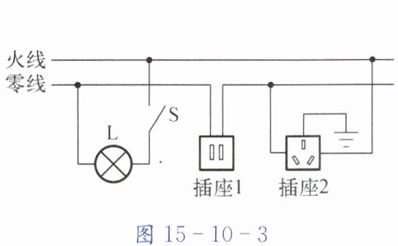 13. 小明根据家庭电路画出图 15-10-3 所示的电路图,其中包括灯泡 L、开关 S、插座 1 和插
