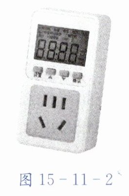 4. 甲同学发现家中接在电路中的用电器关机后却仍在耗电。在家长指导下,甲、乙、丙三名同学将计量插座接入家庭电路,并把用电器的电源插头插在计量插座(图 15 - 11 - 2)上,使用电器处于关机状态,计量插座就能显示用电器处于该状态下的实际功率。测得的数据如下表所示(单位:W)。