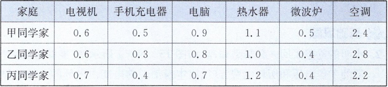 (3) 用电器使用后应及时拔掉插头,这样可以有效节约电能。通过此方式,甲同学家(表中用电器各一台)每天至少可节约多少电能(设各用电器每天的关机时间为 20 h)?