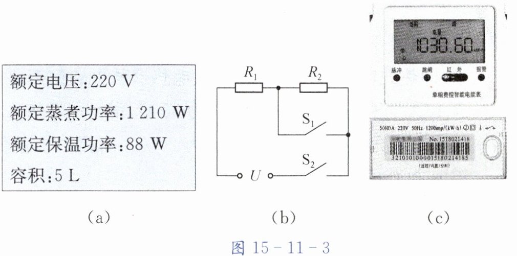(3) 某天,小明想利用自家的电能表[图 15 - 11 - 3(c)]测量家庭电路的实际电压。于是他关闭了家中其他所有用电器,只让电饭锅在“蒸煮”状态下工作,观察到电能表脉冲指示灯在 1 min 内闪烁了 20 次,求小明家家庭电路的实际电压。