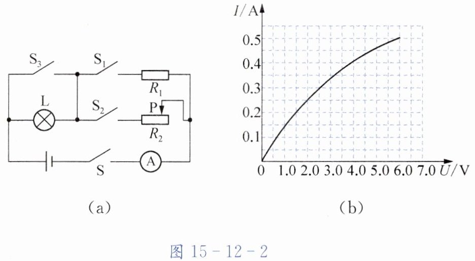3. 如图15 - 12 - 2(a)所示电路中,电源电压为6V,灯泡L规格为“6V 3W”,其电流与电压的关系如图15 - 12 - 2(b)所示。当S、$S_1$、$S_3$闭合,$S_2$断开时,电流表示数为0.5A。