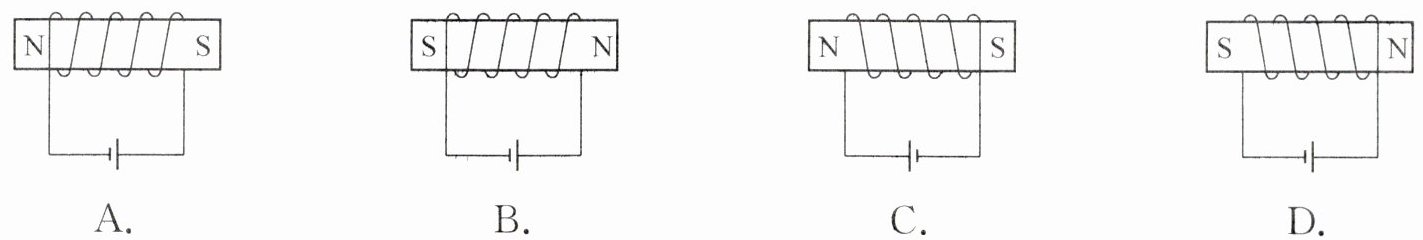 对于选项A:电流从螺线管左端流入,右端流出,四指弯曲方向与电流方向一致,大拇指指向左端,左端应为N极,右端为S极,与图中标记不符。