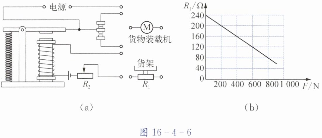 电器、货物装载机(实质是电动机)、压敏电阻$R_1$和滑动变阻器$R_2$等。压敏电阻$R_1$的阻值随压力F的变化关系如图16-4-6(b)所示。当货架承受的压力达到限定值时,电磁继电器会自动控制货物装载机停止向货架上摆放物品。已知控制电路的电源电压$U = 6 V$,电磁继电器线圈的阻值和货架质量忽略不计。