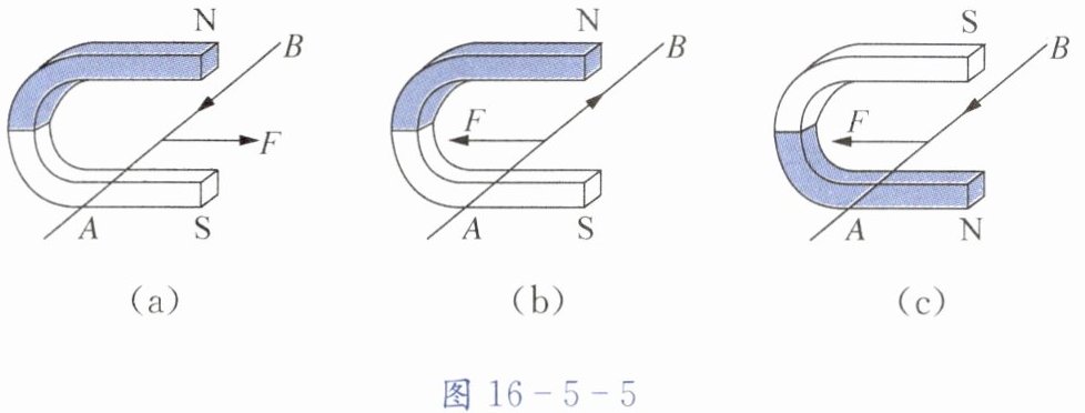 5. 如图 16-5-5 所示,小明探究通电导体在磁场中的受力方向与哪些因素有关。图中 AB 表示闭合电路中的一段直导线,导线上的箭头方向表示电流方向,F 表示导线受力方向,则(