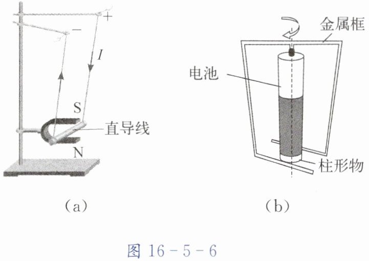 (2) 小华按图 16-5-6(b)制作了一个转框,框的上部中央与电池正极相连,下部紧贴在与电池负极相连的柱形物两侧,金属框就可以绕电池持续转动。由此可知,构成柱形物的材料应具有较好的