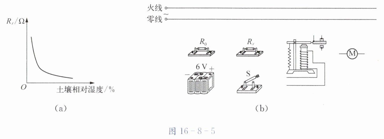 ① 湿敏电阻$R_{x}$的阻值随所在土壤湿度变化的图像如图 16-8-5(a)所示。已知:蓄电池电压恒为 6 V;电磁继电器线圈电流大于 0.2 A 时衔铁被吸下,小于 0.2 A 时衔铁被弹回,线圈电阻不计;电动机的额定电压为 220 V。请以笔画线代替导线完成图 16-8-5(b)所示的电路连接。要求:闭合开关 S,当土壤相对湿度低于 50%时,电动机转动送水;当土壤相对湿度高于 50%时,电动机不转并停止送水。