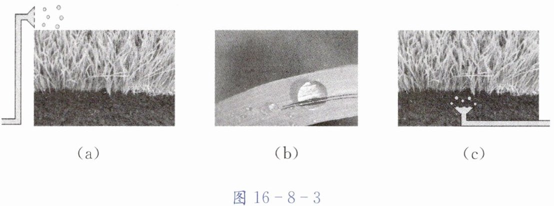 ① 传统灌溉采用如图 16-8-3(a)所示的喷洒技术,这会导致草叶灼伤。这是因为,水喷洒在草叶上,如图 16-8-3(b)所示,透过水珠可见叶面正立、放大的