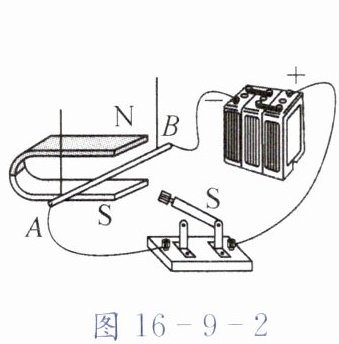 2. 如图 16-9-2 所示,闭合开关 S,导体棒 AB 水平向左运动。若同时对调电源与磁体的磁极,再次闭合开关 S 时,则导体棒 AB 的运动方向是
