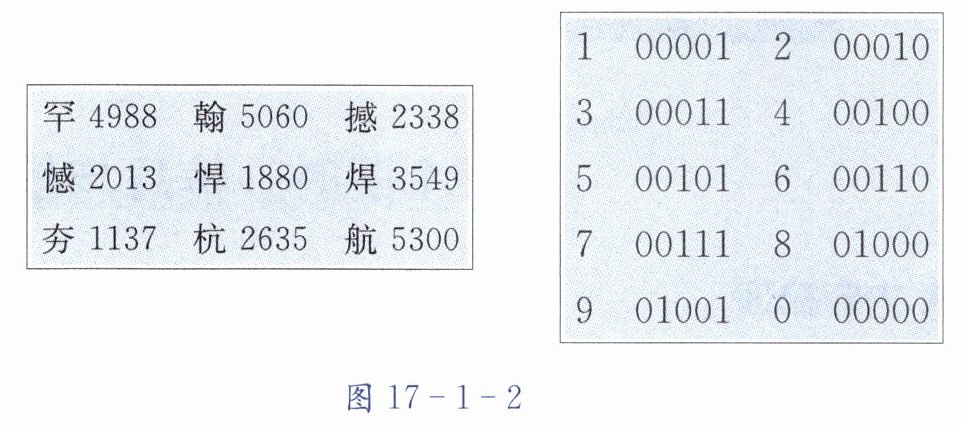 12. 某人收到了一份电报码,其中有一个字的代码是“00010,00110,00011,00101”,请根据图 17 - 1 - 2所示的电报码将这个字译出来,这个字是