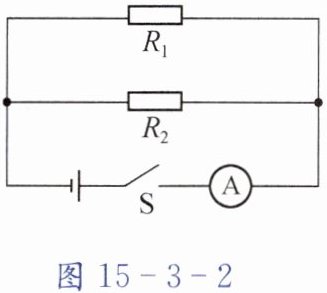 10. 如图 15-3-2 所示,定值电阻$R_1$为$10 \Omega$,电流表示数为$3 A$。已知电路总功率为$30 W$,求: