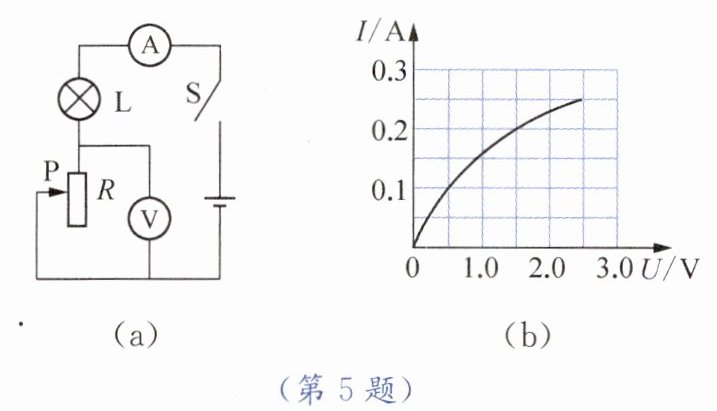 5. 图(a)所示电路中,电源电压恒定,灯泡L的额定电流为$0.25\mathrm{A}$,其电流与电压关系如图(b)所示,滑动变阻器R规格为“$50\Omega\ 1\mathrm{A}$”,电流表量程为$0\sim0.6\mathrm{A}$,电压表量程为$0\sim3\mathrm{V}$。闭合开关S,调节滑片P,当电压表的示数为$1.5\mathrm{V}$时,L恰好正常发光,则L正常发光时的阻值为