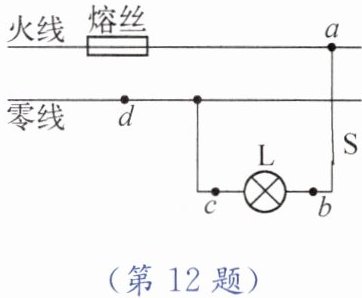 12. 如图所示的家庭电路中,正常发光的灯泡L突然熄灭,电工用氖管测电笔分别测$a、b、c、d$四点,发现$a、b$两点氖管都发光,$c、d$两点氖管都不发光。若电路只有一处故障,则可能是(