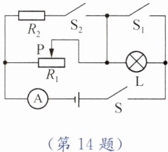 14. 如图所示,电源电压恒为$12\mathrm{V}$,灯泡L的规格为“$6\mathrm{V}\ 3\mathrm{W}$”,滑动变阻器$R_1$上标有“$20\Omega\ 1\mathrm{A}$”字样,$R_2=10\Omega$,电流表量程为$0\sim3\mathrm{A}$。将开关S闭合,$S_1、S_2$断开,调节滑动变阻器使灯泡正常发光。