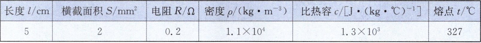 熔丝的体积:$V=lS=5\mathrm{cm}×2\mathrm{mm}^{2}=5×10^{-2}\mathrm{m}×2×10^{-6}\mathrm{m}^{2}=1×10^{-7}\mathrm{m}^{3}$