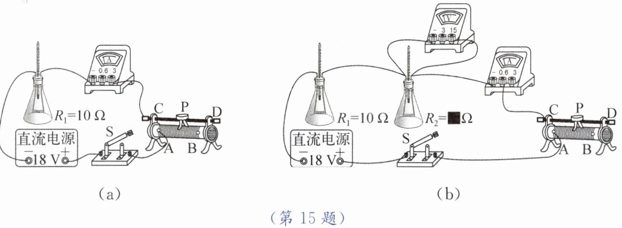 答案:15 (1)右 ②电流不变,电阻不变,通电时间越长,电热越大 ③左 电阻不变,通电时间不变,电流越大,电热越大 ④不能准确测量出电阻丝放出多少热量 (2)$R_{2}$断路 8 0.5 16 $R_{2}$ (3)等于 大于