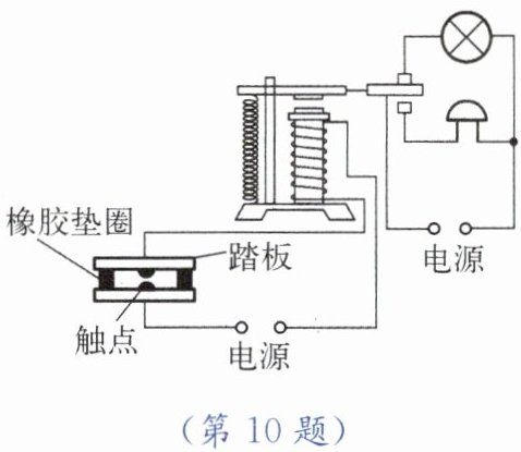10. 如图所示是小明为某仓库设计的一种防盗报警器,其踏板放在仓库门口,电铃和灯泡放在值班室内。由电路可知(