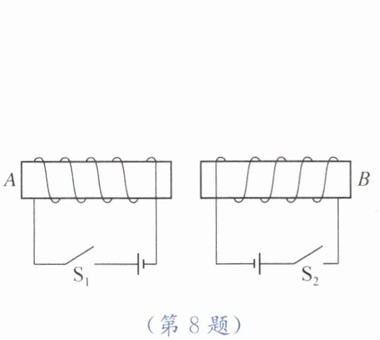 8. 如图所示,闭合开关 $ S_1$、$ S_2$,两个通电螺线管的相互作用情况,以及 $A$、$B$ 端的极性分别是(