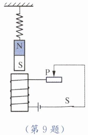 9. 如图所示,闭合开关S,磁体处于静止状态。当滑动变阻器的滑片 P 缓慢向右移动时,悬挂磁体的弹簧的长度变化情况是(