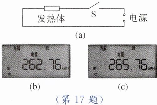 17. (12 分)小刚家有一台电热烘干机,它的工作原理如图(a)所示。它的铭牌已经变得模糊不清,只知道额定电压为 220 V。为了知道该电热烘干机的额定电功率,小刚关闭其他用电器,只让电热烘干机在额定电压下工作。图(b)是电热烘干机工作前电能表的示数,图(c)是电热烘干机工作 6 h 后电能表的示数。(假设电热烘干机工作时的电能全部转化为内能)求: