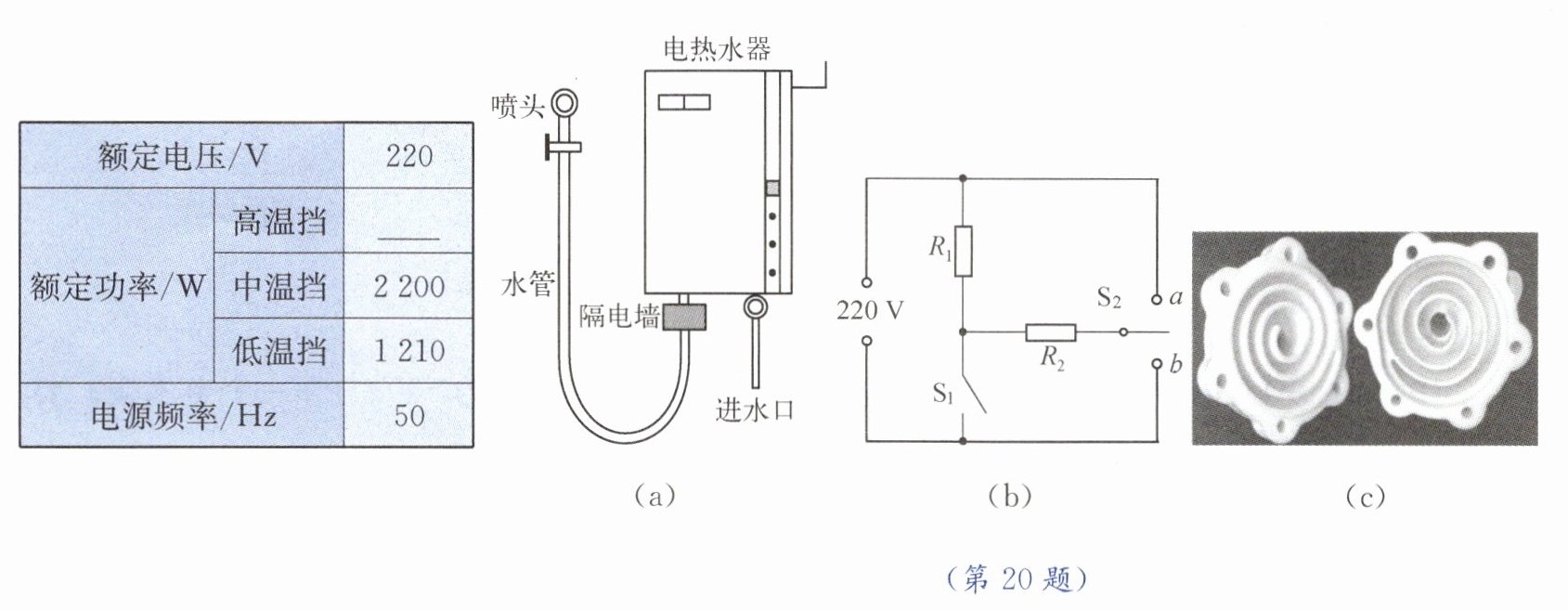 20. (12 分)如图(a)所示为一台电热水器,下表为该热水器的相关技术参数,其中高温挡的额定功率模糊不清。图(b)为该电热水器的内部简化电路,$R_1$、$R_2$为电热丝(阻值未知),$S_1$、$S_2$为挡位开关,$S_2$只能在 a、b 之间切换。电热水器在使用过程中会有漏电危险,当发生漏电时,电流会沿着水管经过喷头流过人体而发生触电事故。为防止触电事故发生,该电热水器在出水口处串接了一个隔电墙。隔电墙内部是一个螺旋状绝缘通道,如图(c)所示。(电源电压为 220 V)