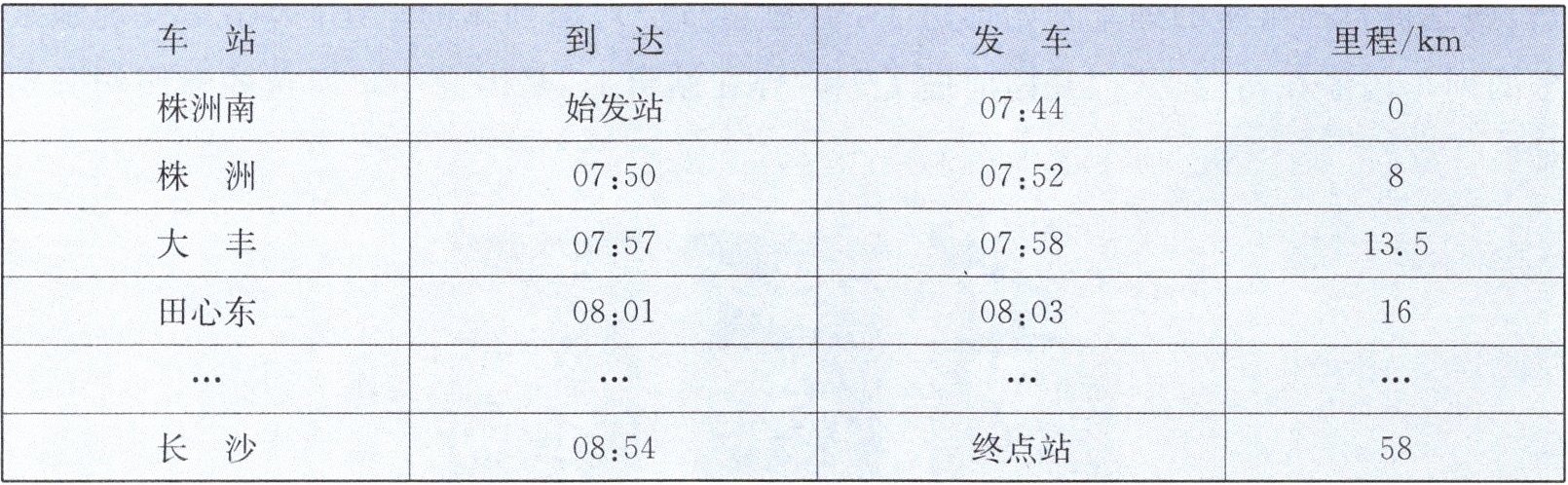 11. 株洲南站到长沙站的某次城际列车运行时刻表如下表所示,根据此表回答下列问题。