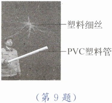 9. 如图所示,在科技节表演中,一位老师用$PVC$塑料管隔空推起塑料细丝,使它不下落。已知塑料细丝带负电荷,则$PVC$管(