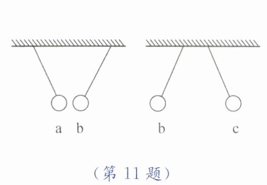 11. $a$、$b$、$c$三个轻质小球,$a$带正电,其相互作用的情况如图所示,$c$的带电情况是