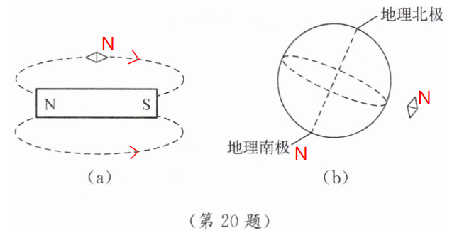 (2)地球周围存在磁场,请在图(b)中标出地磁场的N极和小磁针的N极。
