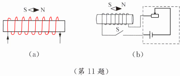 11. (1)如图(a)所示,请根据小磁针静止时N极的指向及螺线管两端导线中的电流方向,画出螺线管的绕法。