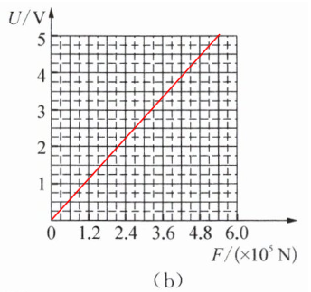 (1) 图像为过原点的倾斜直线,描点(0,0)、(1.2×10⁵N,1V)、(2.4×10⁵N,2V)、(3.6×10⁵N,3V)、(4.8×10⁵N,4V)、(6.0×10⁵N,5V)并连线。