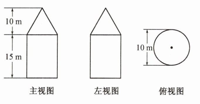 由三视图可知,圆柱和圆锥的底面直径$d = 10m$,则半径$r=\frac{d}{2}=5m$,圆柱的高$h_{柱}=15m$,圆锥的高$h_{锥}=10m$。