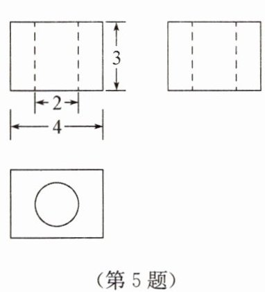 圆柱侧面积:$π×2×3 = 6π$,上下底面积:$2×π×(1)^2 = 2π$,挖去圆柱后表面积增加圆柱侧面积,减少两个底面积,即增加$6π - 2π = 4π$
