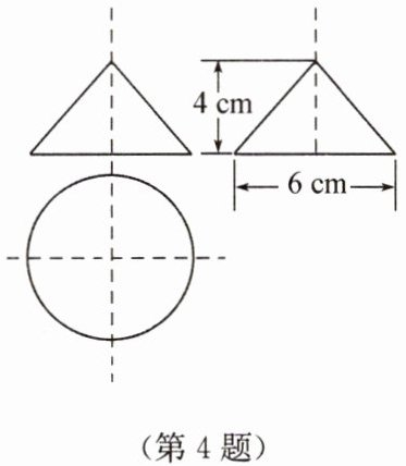 由三视图可知该几何体为圆锥,底面直径为6cm,高为4cm。