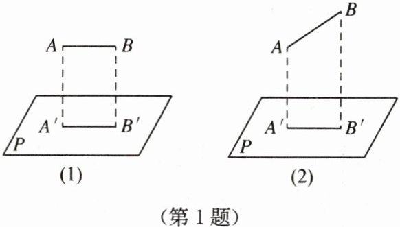 答案:1. 解:(1) 由正投影的性质得$A'B' = AB = 1$. (2) 由正投影的性质知道$AB$,$A'B'$在同一个平面内,将问题转化到平面$ABB'A'$中讨论. 如图,过点$A$作$AC // A'B'$,交投影线$BB'$于点$C$,由正投影的性质知$AC$的正投影是$A'B'$,故四边形$AA'B'C$是矩形,$A'B' = AC$.
