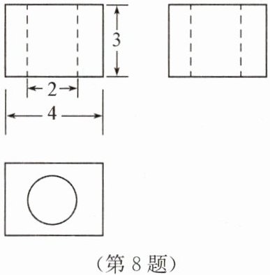 由三视图可知,该几何体为长方体中间挖去一个圆柱体。长方体的长为4,宽为4,高为3;圆柱体的底面直径为2,高为3。