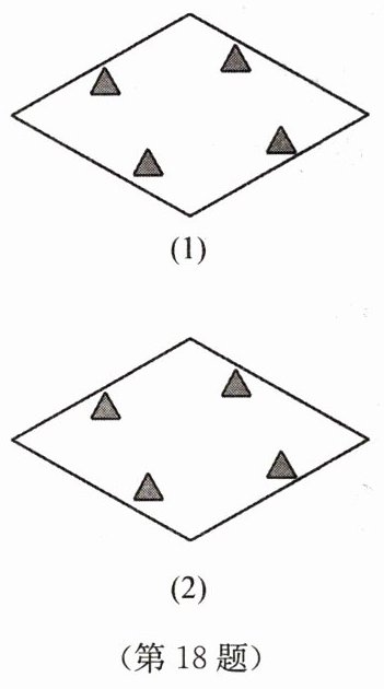18. (6 分)如图,菱形公园内有四个景点,请你用两种不同的方法,按下列要求设计成四个部分:(1)用直线分割;(2)每个部分内各有一个景点;(3)各部分的面积相等(可用铅笔画,只要求画图正确,不写画法)。