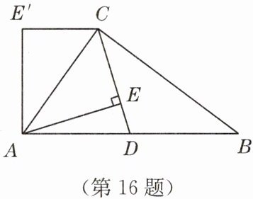 16. 如图,在 $ △ ABC $ 中,已知 $ AC = 3 $,$ BC = 4 $,点 $ D $ 为边 $ AB $ 的中点,连接 $ CD $,过点 $ A $ 作 $ AE ⊥ CD $ 于点 $ E $,将 $ △ ACE $ 沿直线 $ AC $ 翻折到 $ △ ACE' $ 的位置。若 $ CE' // AB $,则 $ CE' = $