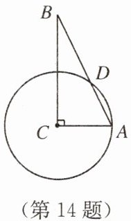 14. 如图,已知在$△ ABC$中,$∠ ACB = 90^{\circ}$,$∠ B = 25^{\circ}$.以$C$为圆心,$CA$为半径的圆交$AB$于$D$点,则$\overset{\frown}{AD}$所对圆心角的度数是