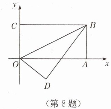 8. 如图,四边形$OABC$是矩形,点$A$的坐标为$(8,0)$,点$C$的坐标为$(0,4)$,把矩形$OABC$沿$OB$折叠,点$C$落在点$D$处,则点$D$的坐标为