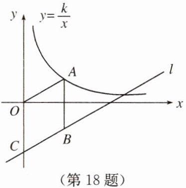 18. 如图,点 $A$ 在双曲线 $y = \frac{k}{x}(k > 0,x > 0)$ 上,点 $B$ 在直线 $y = mx - 2b(m > 0,b > 0)$ 上,$A$ 与 $B$ 关于 $x$ 轴对称,直线 $l$ 与 $y$ 轴交于点 $C$,当四边形 $AOCB$ 是菱形时,有以下结论: