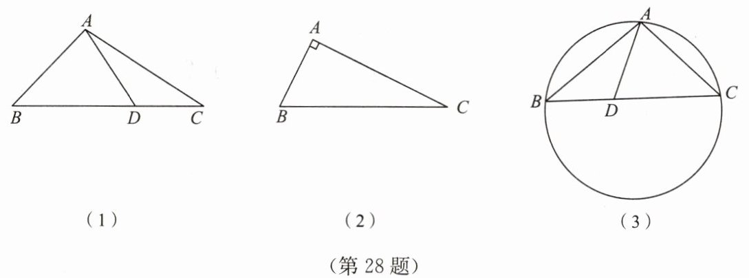 答案:28. 解:[概念应用] $∵$满足比例式 $\frac{AD}{BD} = \frac{CD}{AD}$时,称点 $D$是 $△ ABC$中 $BC$边上的“射影点”,$∴AD^2 = BD×CD$,$∴3^2 = 4CD$,$∴CD = \frac{9}{4}$