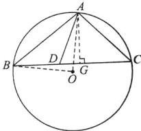 [探究2] 过点 $A$作 $AG⊥BC$于点 $G$,取圆心 $O$,连接 $OB$,$OA$,$∴∠AOB = 2∠C = 2×45^{\circ} = 90^{\circ}$。$∵AO = OB$,$∴AB = \sqrt{OA^2 + OB^2} = \sqrt{2}$,$OA = \sqrt{2}×\frac{5\sqrt{2}}{2} = 5$。$∵\tan∠B = \frac{AG}{BG} = \frac{3}{4}$,
