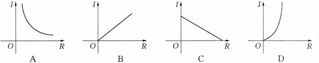 解:由题意知,$I = \frac{U}{R}$,电压$U$一定且$U>0$,电阻$R>0$,电流$I>0$。该函数为反比例函数,其图象在第一象限,且$I$随$R$的增大而减小。选项A符合此特征。