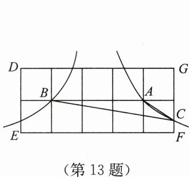 13. 如图,在平面直角坐标系中有一个 $ 5×2 $ 的矩形 $ DEFG $ 网格,每个小正方形的边长都是 1 个单位长度,反比例函数 $ y = \dfrac{k}{x}(k ≠ 0,x > 0) $ 的图象经过格点 $ A $(小正方形的顶点),同时还经过矩形 $ DEFG $ 的边 $ FG $ 上的点 $ C $,反比例函数 $ y = -\dfrac{k}{x}(k ≠ 0,x < 0) $ 的图象经过格点 $ B $,且 $ S_{△ ABC} = 1 $,则 $ k = $