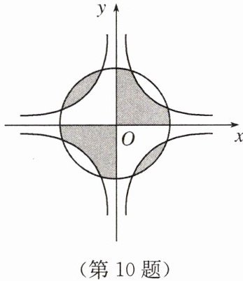 10. 如图,$ \odot O $ 的半径为 2,双曲线的解析式分别为 $ y = \dfrac{1}{x} $ 和 $ y = -\dfrac{1}{x} $,则阴影部分的面积是