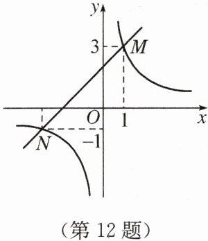 12. 如图,双曲线 $ y = \dfrac{m}{x} $ 与直线 $ y = kx + b $ 交于点 $ M $,$ N $,并且点 $ M $ 的坐标为 $ (1,3) $,点 $ N $ 的纵坐标为 $ -1 $.根据图象信息可得关于 $ x $ 的方程 $ \dfrac{m}{x} = kx + b $ 的解为