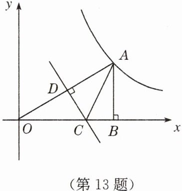 13. 如图,点 $ A $ 在曲线 $ y = \frac{3}{x}(x > 0) $ 上,过点 $ A $ 作 $ AB ⊥ x $ 轴,垂足为 $ B $,$ OA $ 的垂直平分线分别交 $ OB $,$ OA $ 于点 $ C $,$ D $。当 $ AB = 1 $ 时,$ △ ABC $ 的周长为