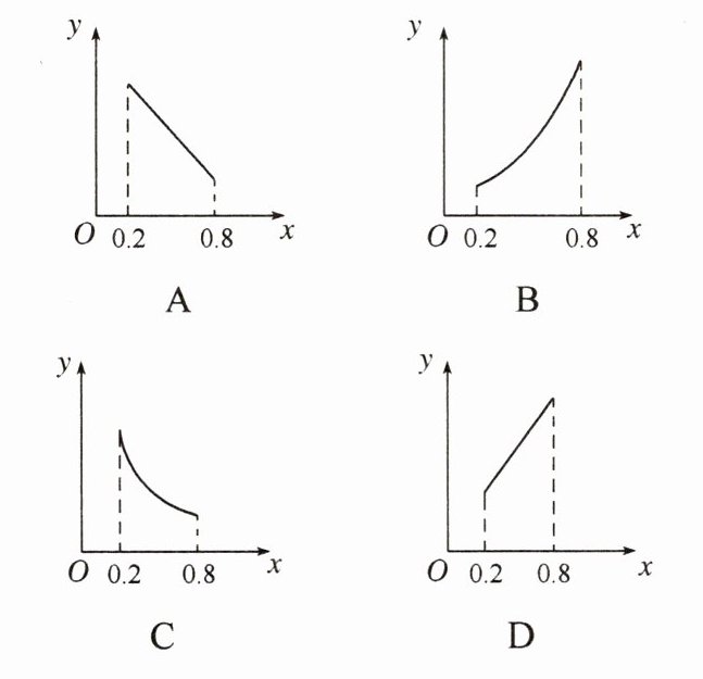∵ $0.2 ≤ x ≤ 0.8$,$y = \frac{1}{x}$ 在该区间内单调递减,且为双曲线一支。