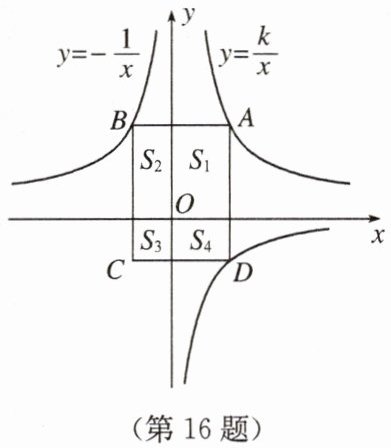 16. 如图,过 $ y = \frac{k}{x}(x > 0) $ 的图象上点 $ A $,分别作 $ x $ 轴,$ y $ 轴的平行线交 $ y = -\frac{1}{x} $ 的图象于 $ B $,$ D $ 两点,以 $ AB $,$ AD $ 为邻边的矩形 $ ABCD $ 被坐标轴分割成四个小矩形,面积分别记为 $ S_1 $,$ S_2 $,$ S_3 $,$ S_4 $,若 $ S_2 + S_3 + S_4 = \frac{5}{2} $,则 $ k $ 的值为