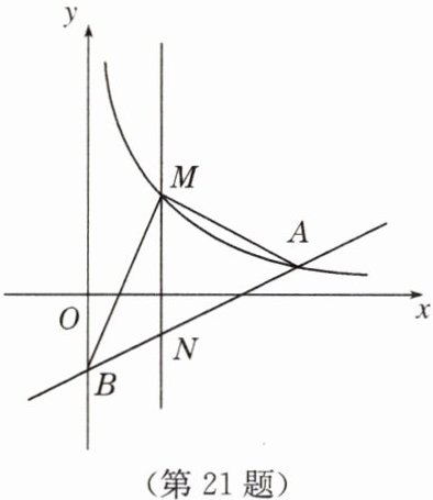 21. (8 分)如图,在平面直角坐标系中,已知点 $ A(8,1) $,$ B(0,-3) $,反比例函数 $ y = \frac{k}{x}(x > 0) $ 的图象经过点 $ A $,动直线 $ x = t(0 < t < 8) $ 与反比例函数的图象交于点 $ M $,与直线 $ AB $ 交于点 $ N $。
